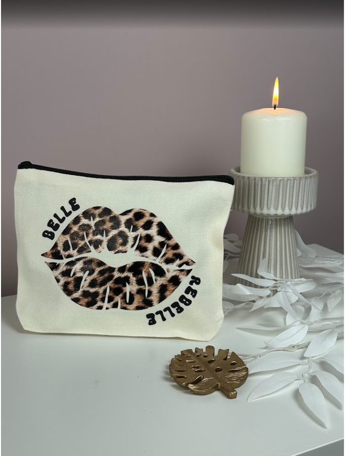 Affirme ton style avec cette pochette au motif lèvres léopard, audacieuse et féminine.