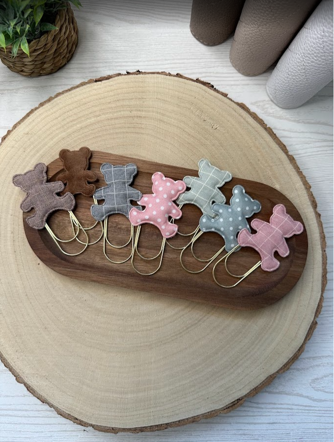 Ces grands trombones dorés sont ornés d’un ourson en tissu décliné dans plusieurs couleurs et motifs, parfaits pour décorer un classeur budget, marquer vos pages d’agenda ou embellir vos carnets.